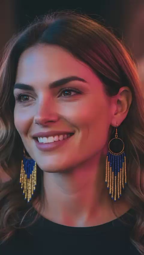 Elevate your everyday style with these handcrafted seed bead earrings featuring stunning blue and gold tones. Each pair is meticulously assembled with quality glass beads, creating a chandelier-inspired design that catches the light beautifully. Perfect for adding a touch of artisanal elegance to any outfit, these earrings showcase the care and attention to detail that goes into handmade jewelry. A versatile accessory that transitions seamlessly from day to night.